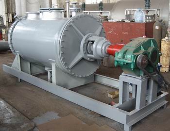真空耙式干燥機】 具有結構簡單,操作方便,使用周期長,性能穩定可靠,蒸汽耗量小,適用性能強,產品質量好,特別適用于不耐高溫、易燃、調溫下易氧化的膏狀物料的干燥,該機經用戶長期使用證明是一良好的干燥設備。原理:被干燥物料從殼體上方正中間加入,在不斷正反轉動的耙齒的攪拌下,物料軸向來回走動,與殼體內壁接觸的表面不斷更新,受到蒸汽的間接加熱,耙齒的均勻攪拌,粉碎棒的粉碎,使物料表面水分更有利的排出,氣化的水分經干式除塵器、濕式除塵器、冷凝器,從真空泵出口處放空。結構:真空耙式干燥機的主要部件